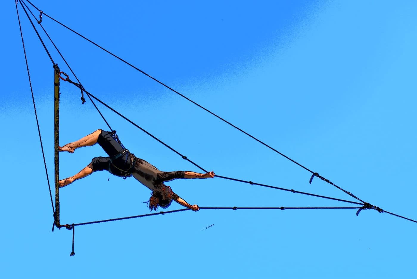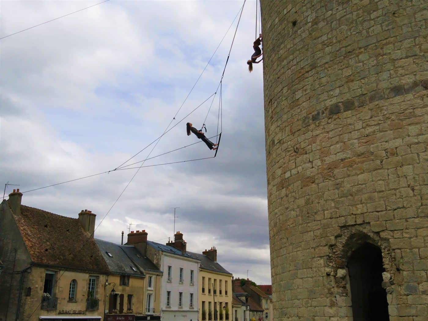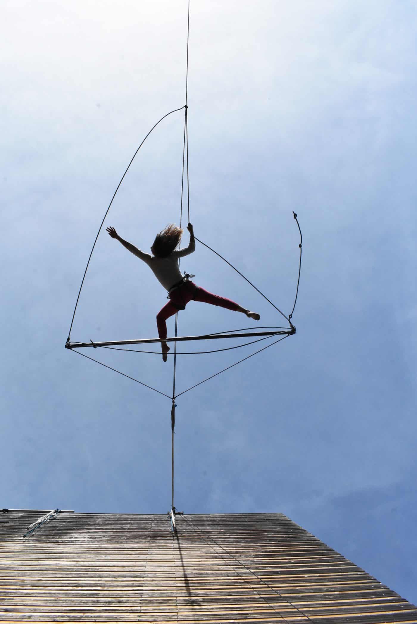 Une performance spectaculaire sur une façade d’immeuble. Sus- pendus entre ciel et béton, les danseurs dessinent une chorégraphie poétique en apesanteur, transformant l’architecture en véritable scène verticale.